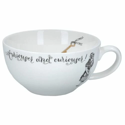 The lid of the teapot features the iconic quote ‘We’re all mad here’, whilst the teacup features the quote ‘Curiouser and curiouser’.