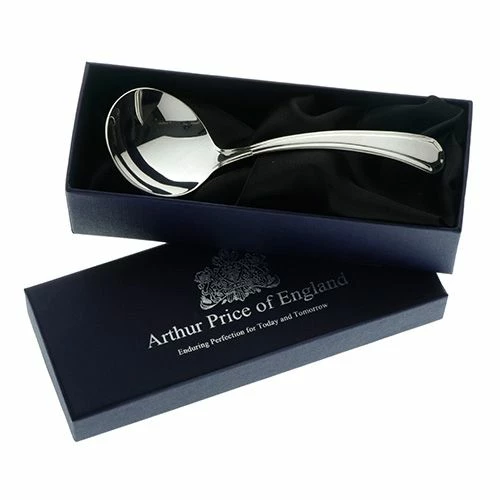 This Arthur Price of England Sovereign Silver Cream Ladle in the Grecian pattern has a silver thickness of up to 40 microns. Unconditionally guaranteed for life and will offer a richness of patination, in time, that is beyond compare.