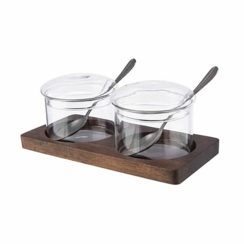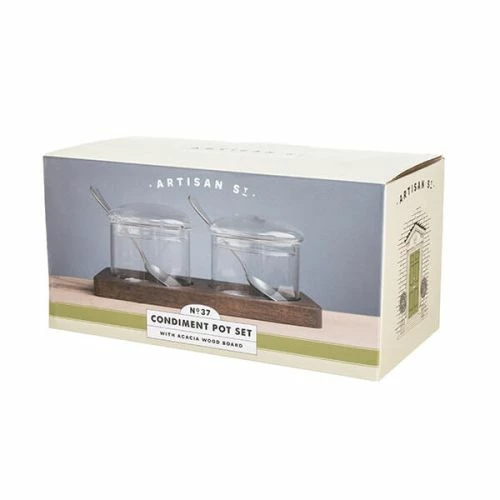The Artisan Street condiment pots are made from glass and are presented on an acacia wooden board with a dark stain finish. The pots can be filled with a selection of jams, dressings and sauces and include a pair of spoons for serving that sit in the pots.