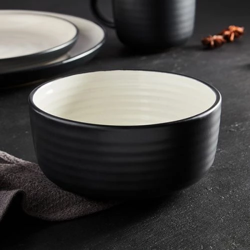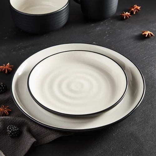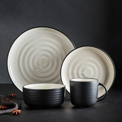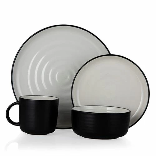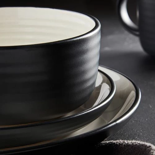 The Barbary & Oak Cascade 16 piece dinnerware set is styled with a contemporary design and made for durable stoneware. The finish features a matte black exterior with a cream speckled glossy interior.
