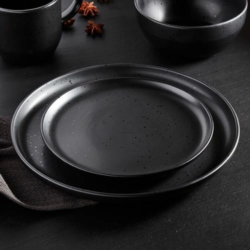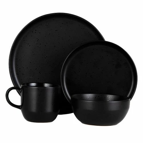 The Barbary & Oak Luna 16 piece dinnerware set is styled with a contemporary design and made for durable stoneware. The finish features a semi-matte speckled black finish.