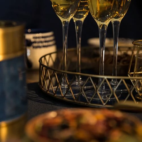 This serving tray features elegant deco inspired raised sides and has a gorgeous blue metal base. The perfect finishing touch to any drinks party.