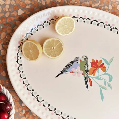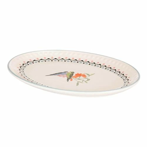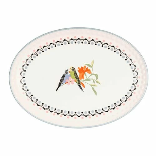 The Cath Kidston Painted Table Ceramic 36cm Oval Platter is a lovely platter for serving at a dinner party. It has an adorable design that flaunts two budgies nestled together on a beautiful flower sprig, bordered by a black, pink and blue patterned frame for a delicate, elegance piece. It has a light blue rim for an extra splash of subtle colour.