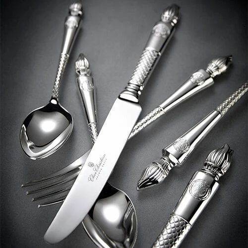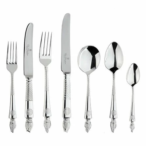 The set includes 8 table knives, 8 table forks, 8 dessert spoons, 8 dessert knives, 8 dessert forks, 8 soup spoons, 8 teaspoons, 8 coffee spoons, 8 fish knives, 8 fish forks, 4 tablespoons and 1 caviar spoon.