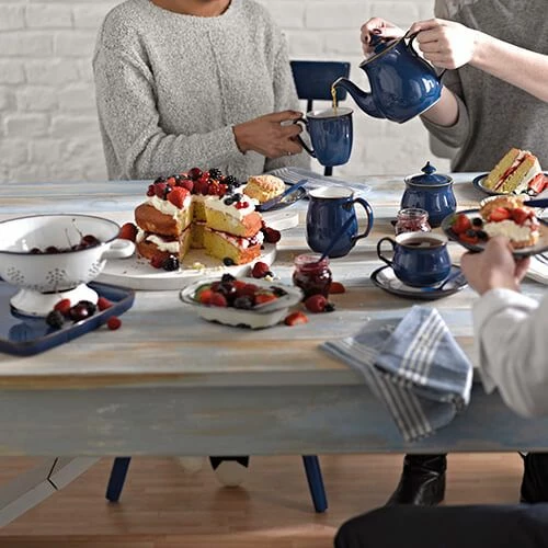 Vibrant blues and crisp whites make it a modern and bold classic with matching utensils and glassware also available.