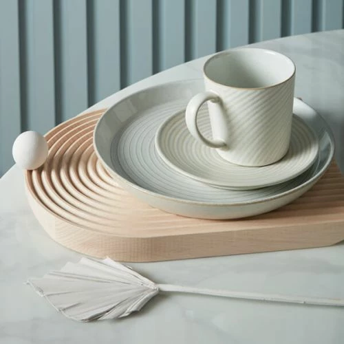 The Impression range from Denby is an uplifting collection that celebrates both colour and design. Using a serene and versatile colour palette of blue, charcoal, cream and pink along with textural hourglass, diamond, spiral and hexagon glazes, the range fits perfectly with modern interiors. The Denby Impression collection also features contemporary shapes such as coupe plates, straight-sided bowls and soju cups. Handcrafted in Derbyshire using locally sourced clay, the Impression range is covered by a 10 year guarantee and is safe to use in the microwave, oven, freezer and dishwasher.