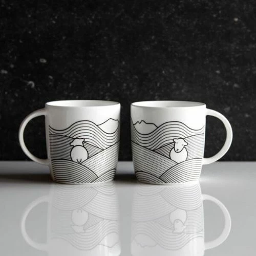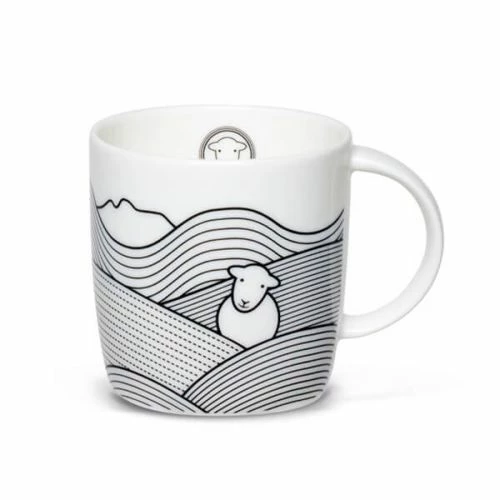 This Herdy line mug is inspired by historic graphite mining in the lake district. The fine bone china mug has a striking black and white pattern of Herdy amongst the landscape of the cumbrian fells.