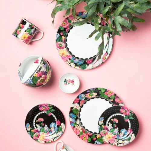 Designed in England by Katie Alice, this dinner plate is made from super white porcelain and is decorated with bright blooms of peony, lilac and iris in a beautiful colour palette of pinks and blues. These blooms sit on a striking black background that is finished by a scalloped edge detail to the inside rim.