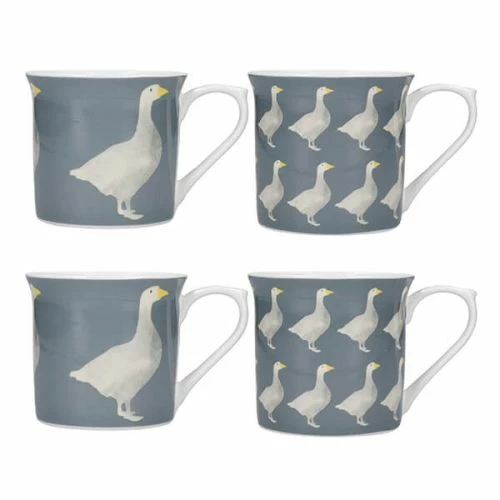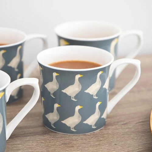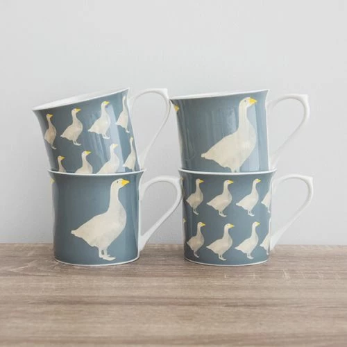 Made from china and with a 300ml capacity, each barrel-shaped mug features a collection of geese on a blue grey background and has an ample handle for a comfortable grip.
