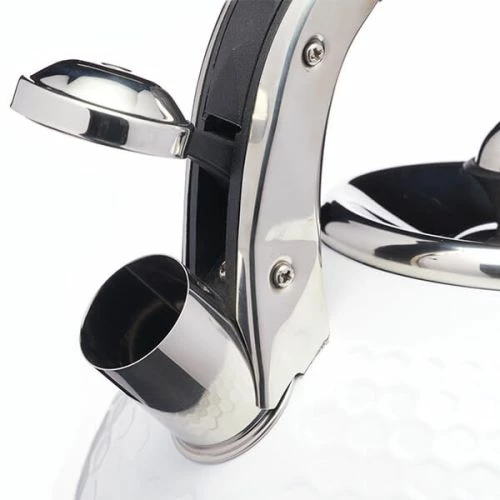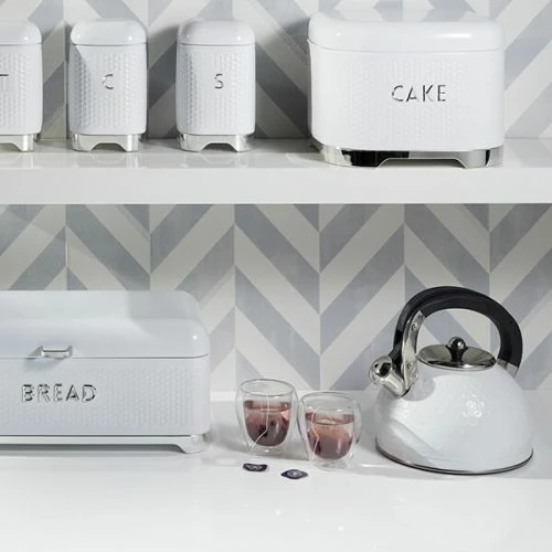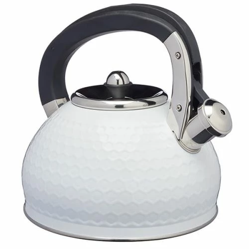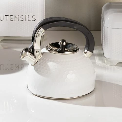 Lovello Retro Ice White Textured 2.5L Whistling Ketlle features a textured finish with small geometric hexagons pressed in to the stainless steel surface.