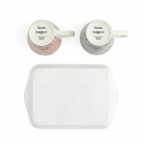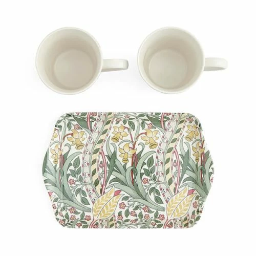 This beautiful set includes two fine bone china mugs and a melamine tray, featuring three Morris & Co. heritage patterns, including the iconic Daffodil Privat design.