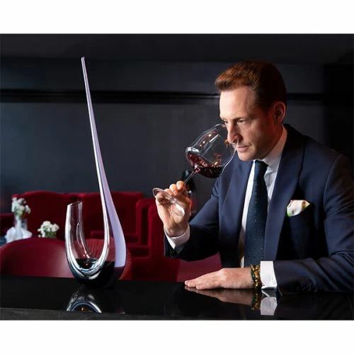 Wine is gently decanted through the large opening then poured from its exquisite neck – long enough to reach any guest at the dinner table.