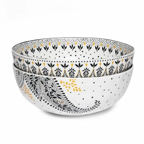 The Sara Miller Artisanne Noir Set of 2 Large Bowls brings a Middle Eastern flare to your dining room with beautiful, unique, mix-and-match designs. These bowls are decorated in a monochrome palette with gold detailing for a truly unique style.