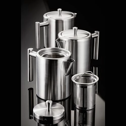 This 800ml stainless steel 4 cup teapot features a removable filter basket for infusing loose tea leaves.