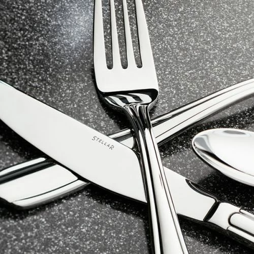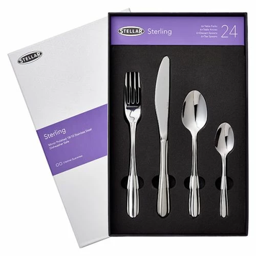 This 24 piece Stellar Sterling Stainless Steel cutlery set is modern in design with a perfect weighted balance.