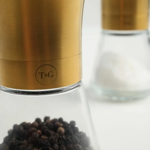 The T&G CrushGrind Tip Top Deco Salt Mill measures 12.5cm high and features a removable glass base for easy refilling.