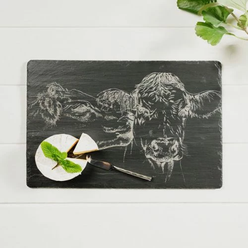 The delightful slate cheese board has been handcrafted in Scotland and is engraved with a pair of kissing cows. A foam backing protects surfaces.