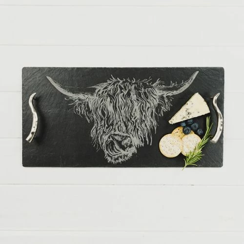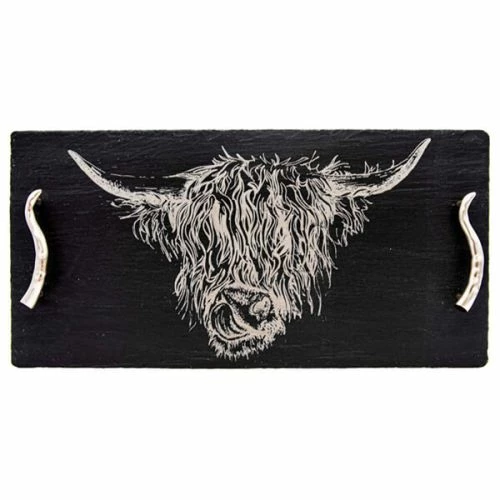 This high quality slate serving tray has been handcrafted in Scotland and is engraved with a shaggy and loveable highland cow.