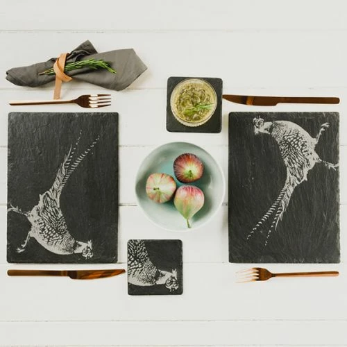 Combine the Just Slate Company Set of 2 Pheasant Slate Place Mats with the matching engraved pheasant coasters and table runner for a coordinated look.