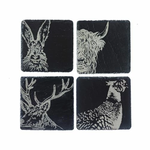 Beautifully handcrafted in Scotland, the Just Slate Company Set of 4 Country Animals Slate Coasters make a lovely table piece for your guests to set their drinks on. Each square slate coaster has been engraved with a stunning hand-illustrated engraving of a British country animal, including a highland cow, a stag, a hare and a pheasant.