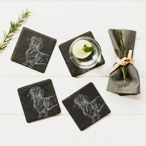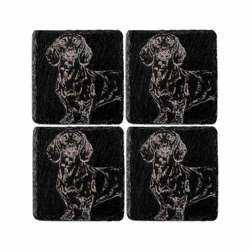 Beautifully handcrafted in Scotland, the Just Slate Company Set of 4 Dachshund Slate Coasters make a lovely table piece for your guests to set their drinks on. Each square slate coaster has been engraved with a stunning hand-illustrated engraving of a cute dachshund.