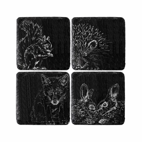 Beautifully handcrafted in Scotland, the Just Slate Company Set of 4 Woodland Friends Slate Coasters make a lovely table piece for your guests to set their drinks on. Each square slate coaster has been engraved with a stunning hand-illustrated engraving of a cute woodland friend, including a squirrel, a hedgehog, a fox and a pair of kissing rabbits.