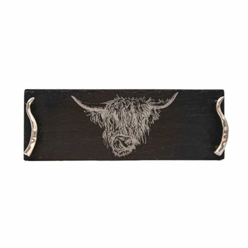 This high quality slate serving tray has been handcrafted in Scotland and is engraved with a shaggy and loveable highland cow.