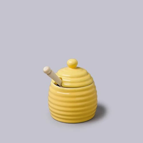 The W M Bartleet & Sons Yellow Honey Pot with Wooden Dipper is a beautifully designed honey pot in the design of a traditional beehive with a classic honey dipper.