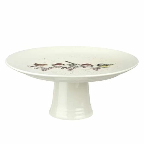 This exquisitely illustrated cake plate features a selection of adorable little birds resting on a snowy branch.